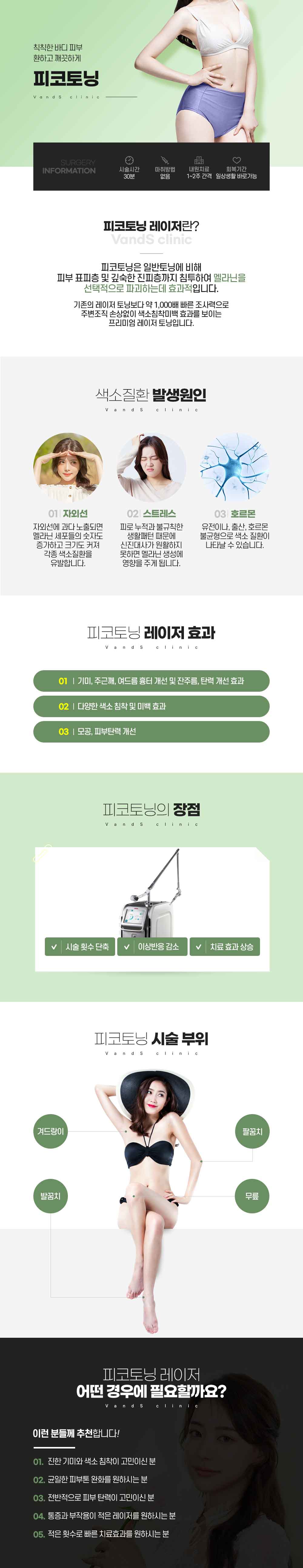 피코토닝은 기존의 레이저토닝 장비의 조사속도인 나노세컨드보다 1000배 빠른 속도로 레이저가 조사되는 장비입니다. 빠른 조사속도로 주변 조직의 손상 및 통증을 최소화하는 장점이 있습니다. 또한 멜라닌에 반응률이 높은 파장대를 사용하므로 더 정밀한 색소치료가 가능합니다. 이 같은 장점으로 레이저 토닝과 동일한 횟수로 시술했을때 피부손상을 최소화하면서 보다 효과적으로 색소개선을 확인할 수 있습니다.
